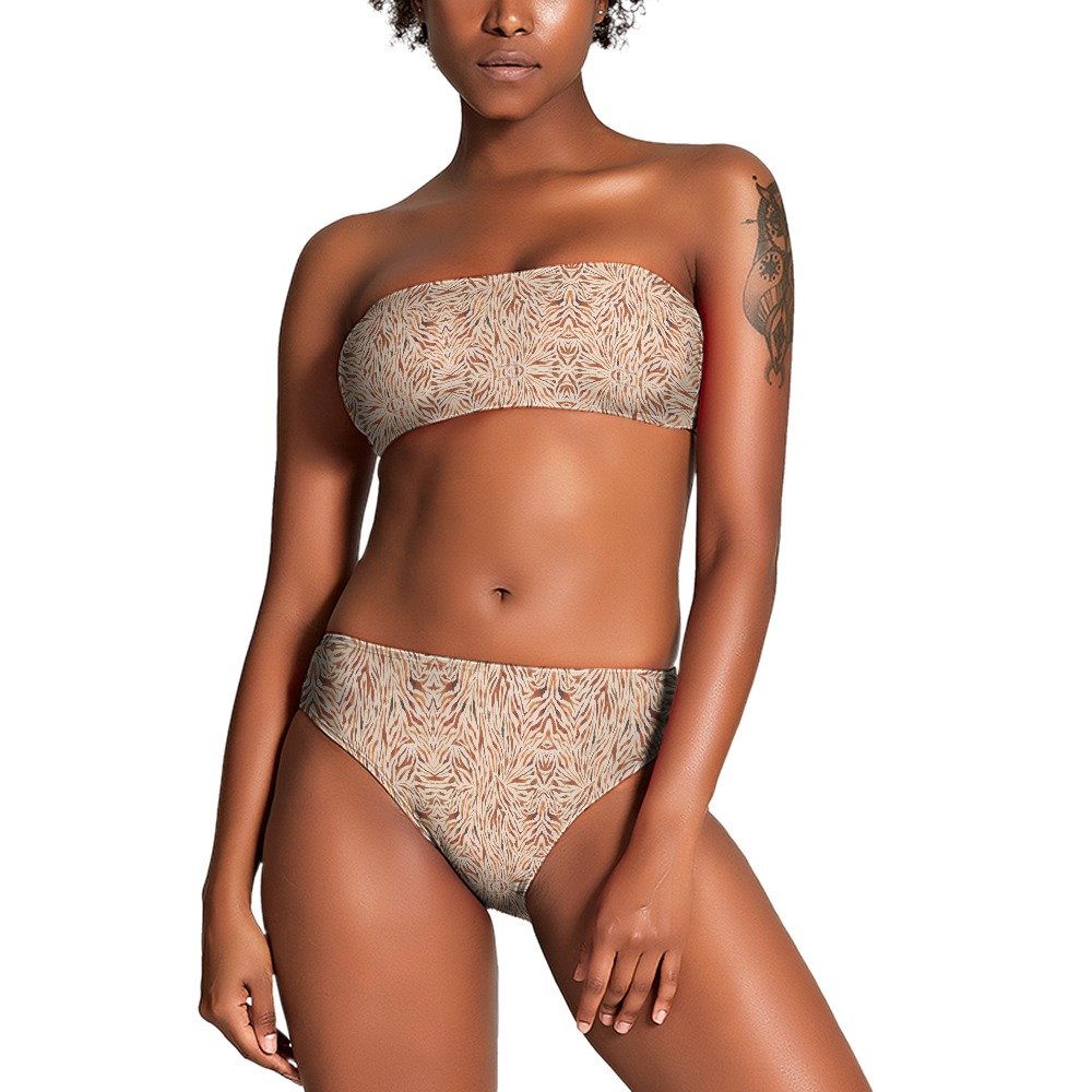 Beige Leaf Print Strapless Bikini Set