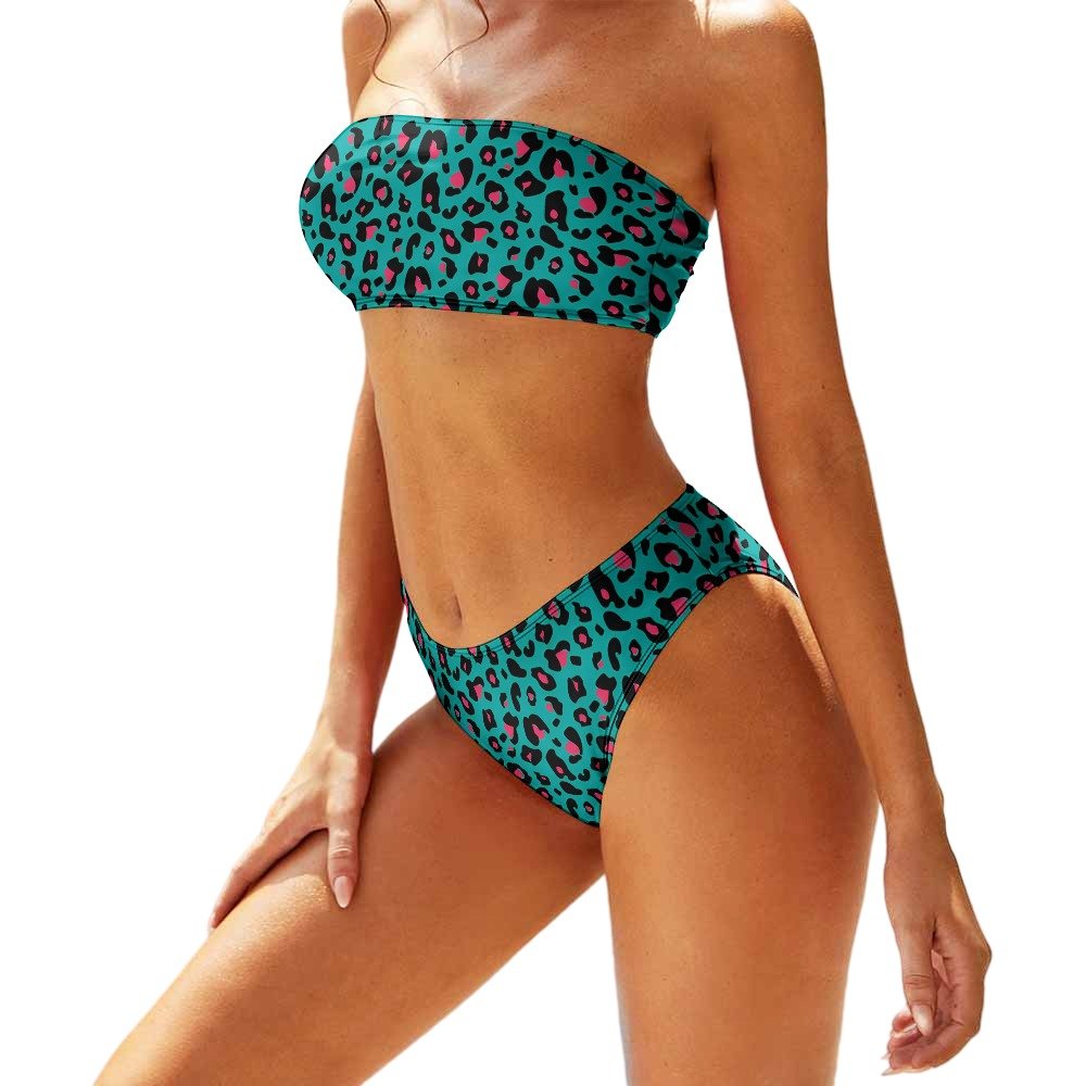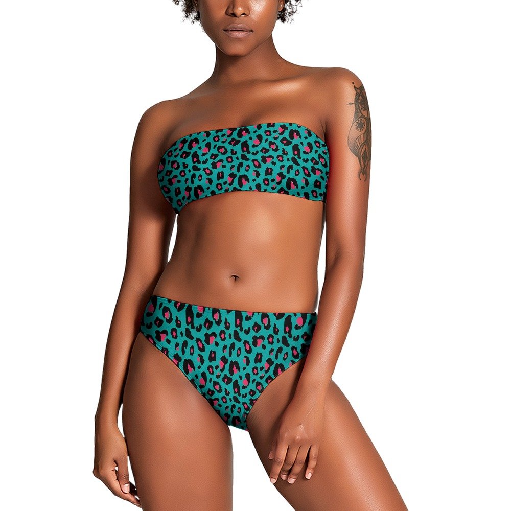 Add a fierce pop of color to your summer wardrobe with this Teal & Pink Leopard Print Strapless Bikini Set. Made from a smooth and stretchy blend of 86% polyester and 14% spandex, it offers a flattering fit that hugs your curves comfortably. The strapless bandeau top highlights your shoulders and neckline, while the low-waisted bikini bottoms accentuate your hips for a feminine, confident look.